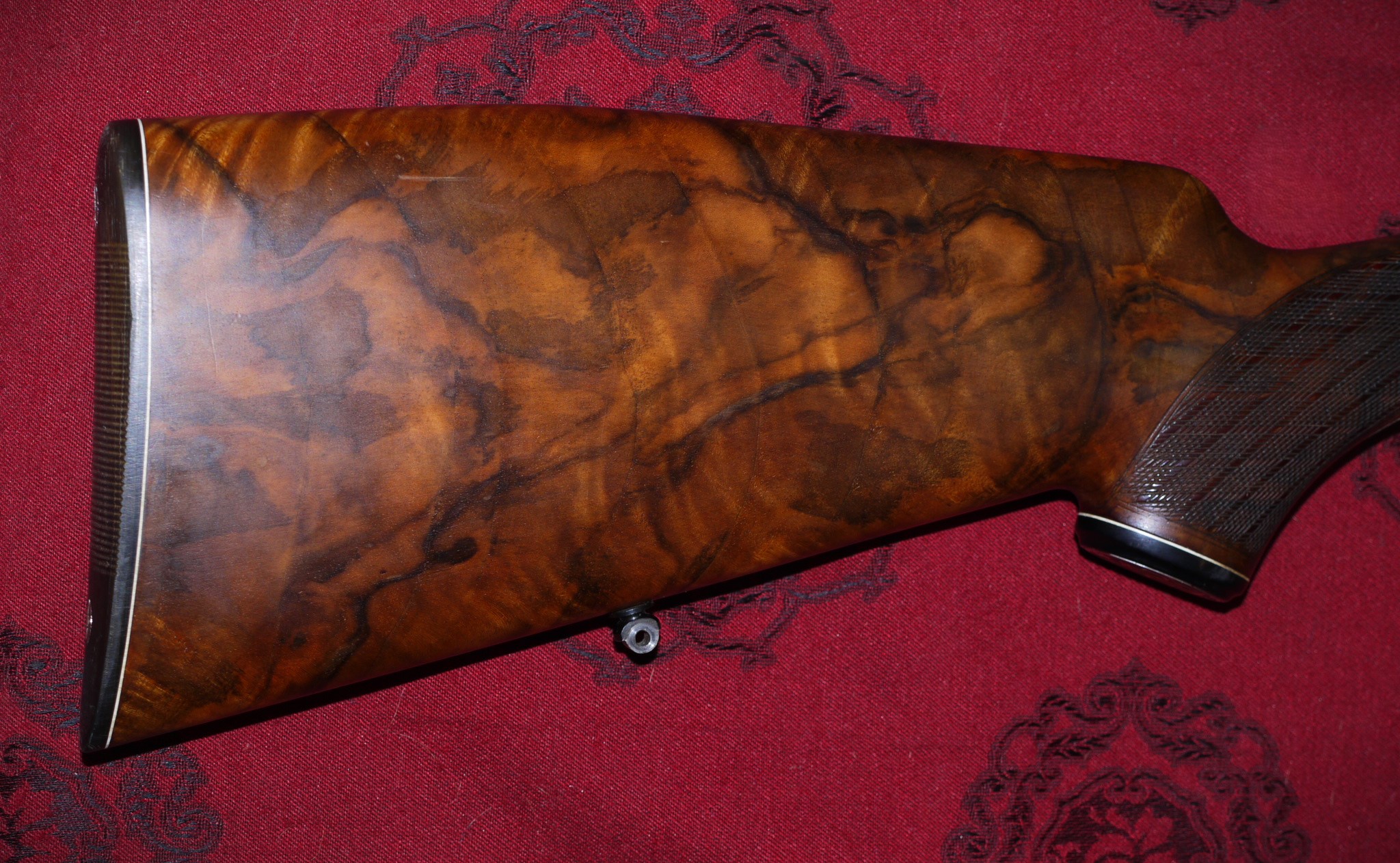 Super Schaftholz, Pistolengriffkäppchen mit Monogramm in Gold.